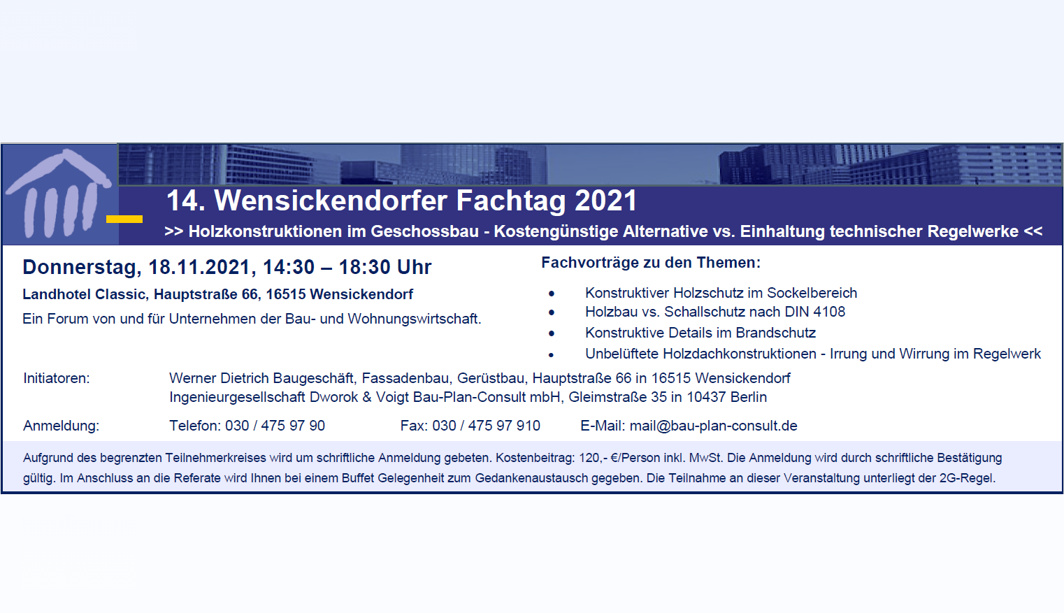 Am 18. November 2021 wird zum 14. Mal das Forum von und für Unternehmen der Bau- und Wohnungswirtschaft in Wensickendorf, bei Berlin, stattfinden.