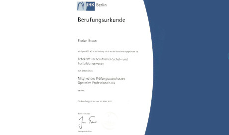 Für die nächsten fünf Jahre wurde unser Bereichsleiter der Planungssäule, Florian Braun, als Mitglied des Prüfungsausschusses der IHK für Operative Professionals berufen. Das Gremium „Prüfungsausschuss“ setzt sich ausschließlich aus ehrenamtlichen Prüfern zusammen – diese leisten einen wertvollen Beitrag zur Fachkräftesicherung.