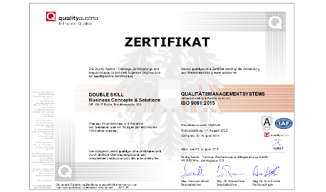 Nunmehr verfügt Double Skill über ein kombiniertes Paket eines anerkannten Qualitätsmanagementsystems für die Fachplanung, Projektierung und Abnahme von Anlagen der technischen Gebäudeausrüstung in den vorgenannten Fachschalen.